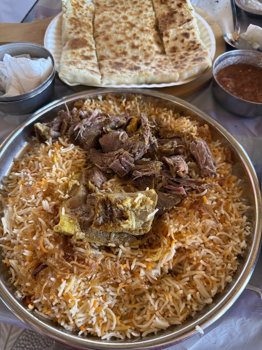 We stopped by this place on our way from the canyon to Nizwa — and we’re really glad we did. The food is excellent, the portions are huge, and the menu is impressively broad, featuring Yemeni and Omani dishes, plus a section with European options. We ordered Yemeni bread and burma meat with rice. Everything was delicious — the portions tried to defeat us, but we won in the end. And the total bill for two came to just 9 rials, which felt like a steal. The service was genuinely friendly, which is always a big plus. The terrace also had water misters, which felt like a blessing in the heat. Highly recommended.
